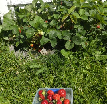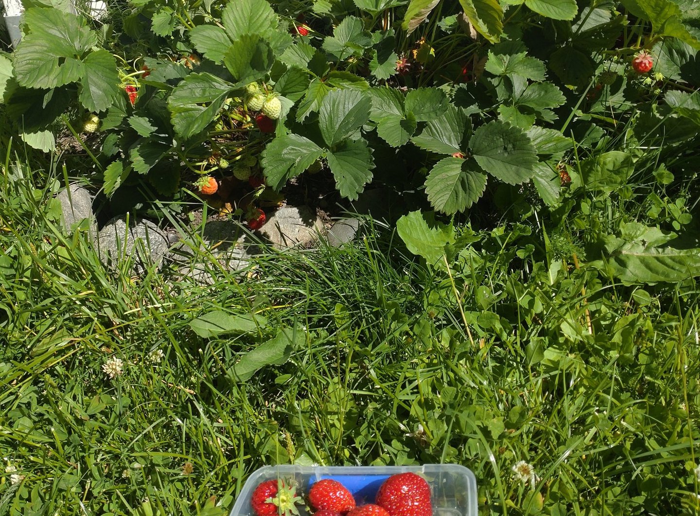 Bildet er fra hagen vår. Det er jordbær fra Høiden i Bardu. Først tok tante Karin med seg bær til Hagan i Nittedal. Så fikk jeg noen unge planter til å plante i skolehagen, da vi ble skolehagens naboer. Så ga jeg opp parsellen, men beholdt nordnorske bær her i hagen. Jeg tenker på sommer, tante Karin, gården på Høiden, Lundberg-familien og smooties jeg skal lage når jeg plukker bærene. Det er altså en merverdi i disse få bærene, som muligens er større enn smaken av de enkelte syrlige bærene.