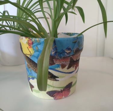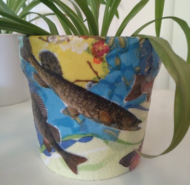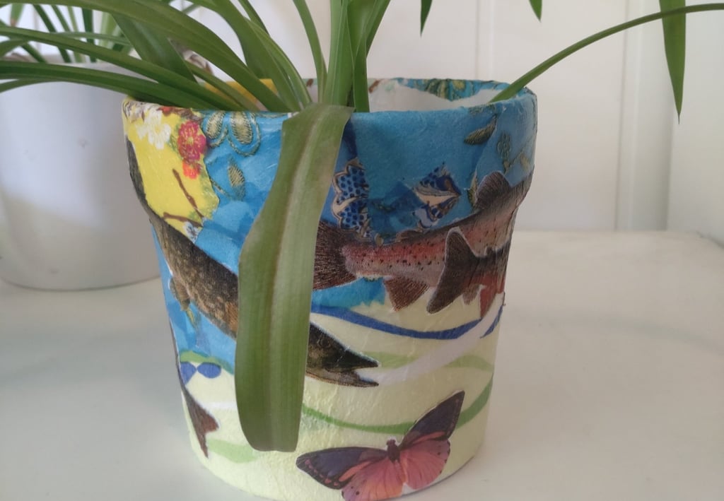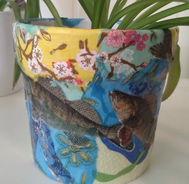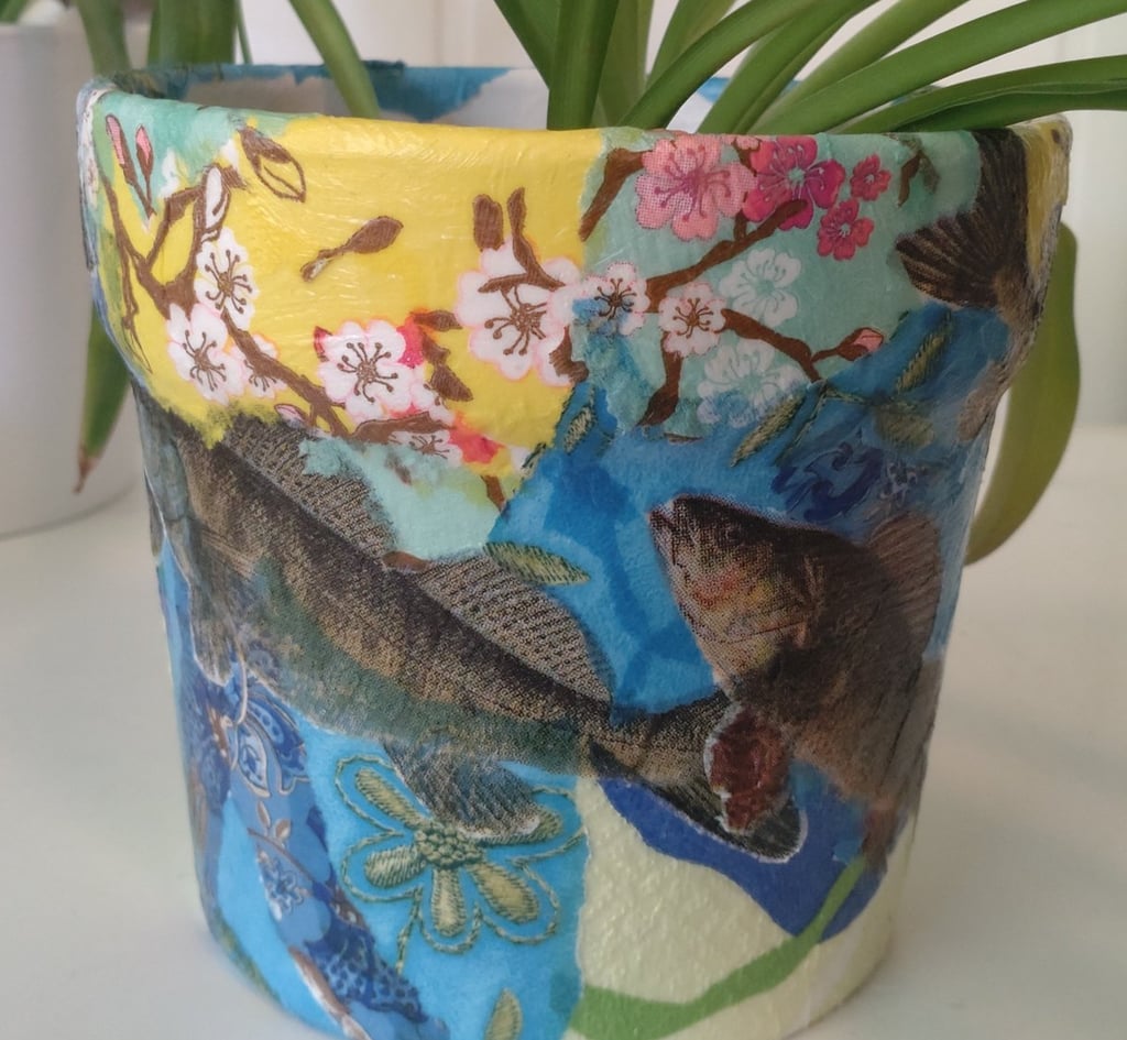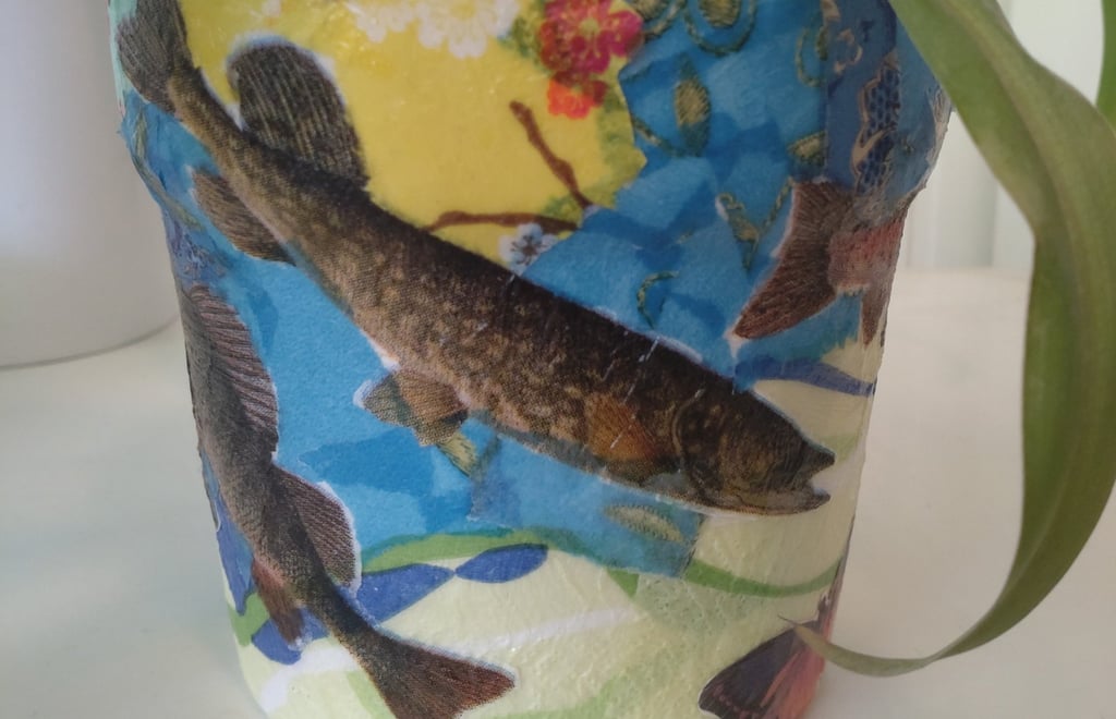 Decopage er også noe jeg liker. Det handler i korte trekk om å rive rispapir i biter og dekorere overflater ved å lime bitene fast med lim som tørker og blir gjennomsiktig. Man vet aldri helt hvordan resultatet blir. Man kan ha en ide, og så jobber intuisjonen og teften. Jeg hørte at servietter også skal være bra å bruke, men de er vanskeligere. Jeg har ikke hatt overskudd til decopage på aldri så lenge, men nå har jeg hørt på Kate Bush sin 50 words for snow og holdt på med decopage lange stunder om gangen. Før Bush hørte jeg noen runder på Kronos Quartet & Asha Bhosle sin You´ve stolen my heart. Den er ganske snodig å få servert sånn i lengden. Jeg holder på å høre meg gjennom cd-ene våre, så jeg plukker med meg 4-5 stykker om gangen og den som jeg setter i spilleren på kjøkkenveggen, får i hvert fall fire runder. Noen får førti. Minst. På grunn av en kombinasjon av latskap og ønske om rutine.